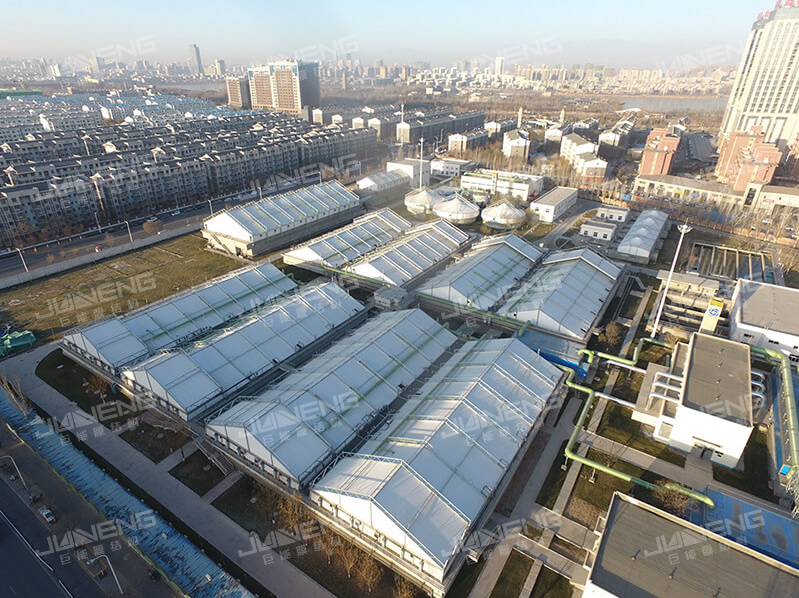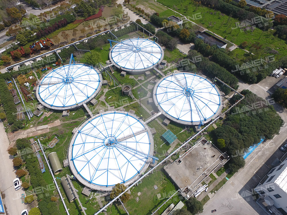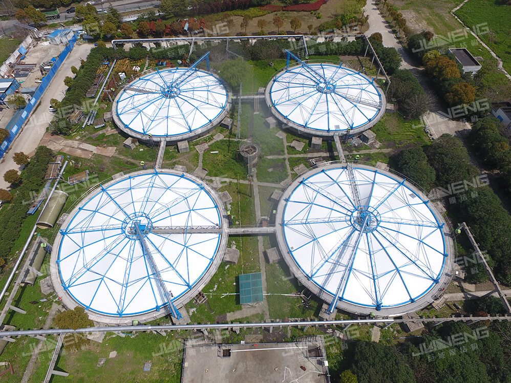 近幾年來(lái),廢氣廢水的不合理排放是造成環(huán)境污染問(wèn)題的主要原因。對(duì)廢氣進(jìn)行收集、凈化處理勢(shì)在必行,使用反吊膜加蓋對(duì)廢氣進(jìn)行收集再處理是現(xiàn)在常用的一種解決方法,反吊膜采用膜材反吊的原理,將鋼結(jié)構(gòu)至于膜材外層,從而解決了鋼結(jié)構(gòu)被池內(nèi)廢氣腐蝕想現(xiàn)象,延長(zhǎng)了鋼結(jié)構(gòu)的使用壽命。