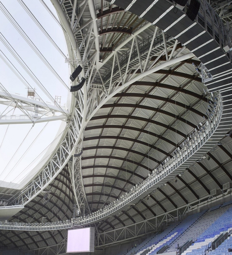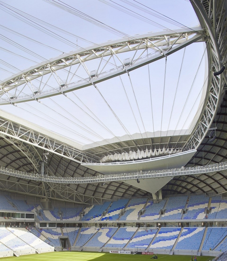體育場包含一個(gè)由Schlaich Bergermann Partner設(shè)計(jì)的可調(diào)節(jié)屋頂,碗型的座位席安裝了制冷系統(tǒng),確保體育場在卡塔爾的炎熱夏季也可以良好地運(yùn)行。可調(diào)節(jié)的屋頂采用了褶皺式PTFE纖維包層和纜索,在展開時(shí)猶如船帆一般覆蓋在球場上方,在夏季時(shí)可提供蔭蔽的比賽環(huán)境。被動(dòng)式設(shè)計(jì)、計(jì)算機(jī)建模和風(fēng)洞測試的運(yùn)用使建筑外殼的性能得到了最大程度的提升,以確保球員和觀眾獲得舒適的體驗(yàn)。