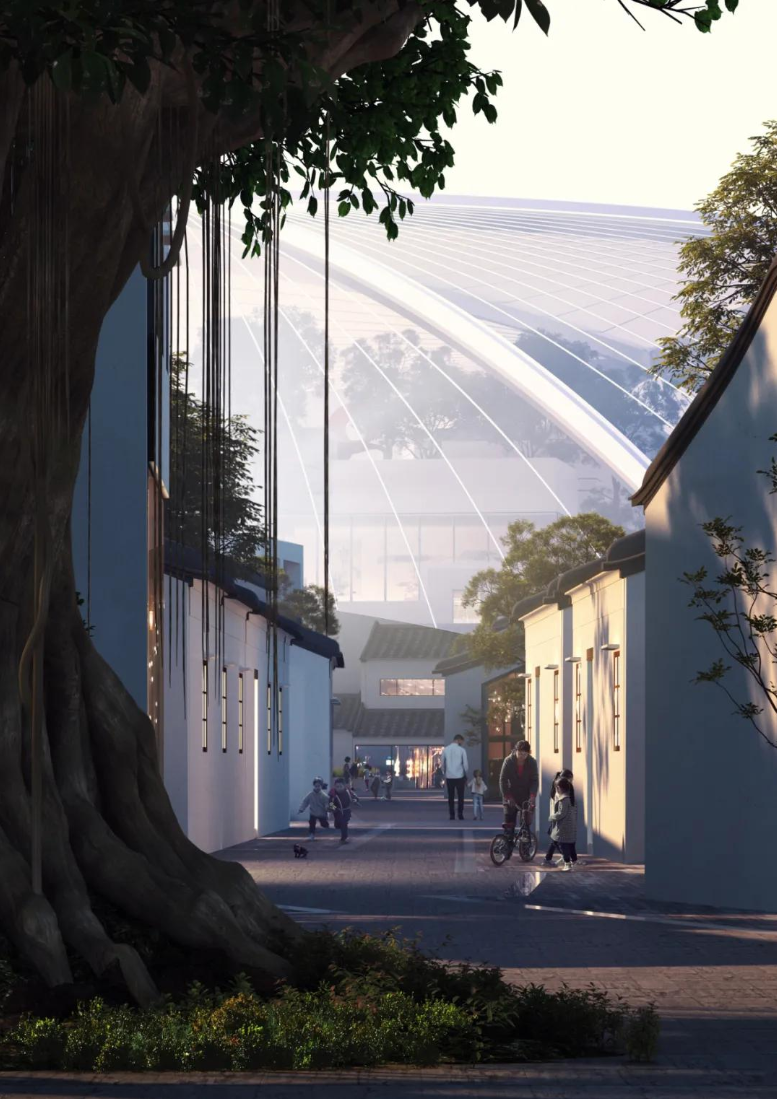 △ 穹頂下是以人為尺度的街道和建筑群,重現(xiàn)原村莊的肌理