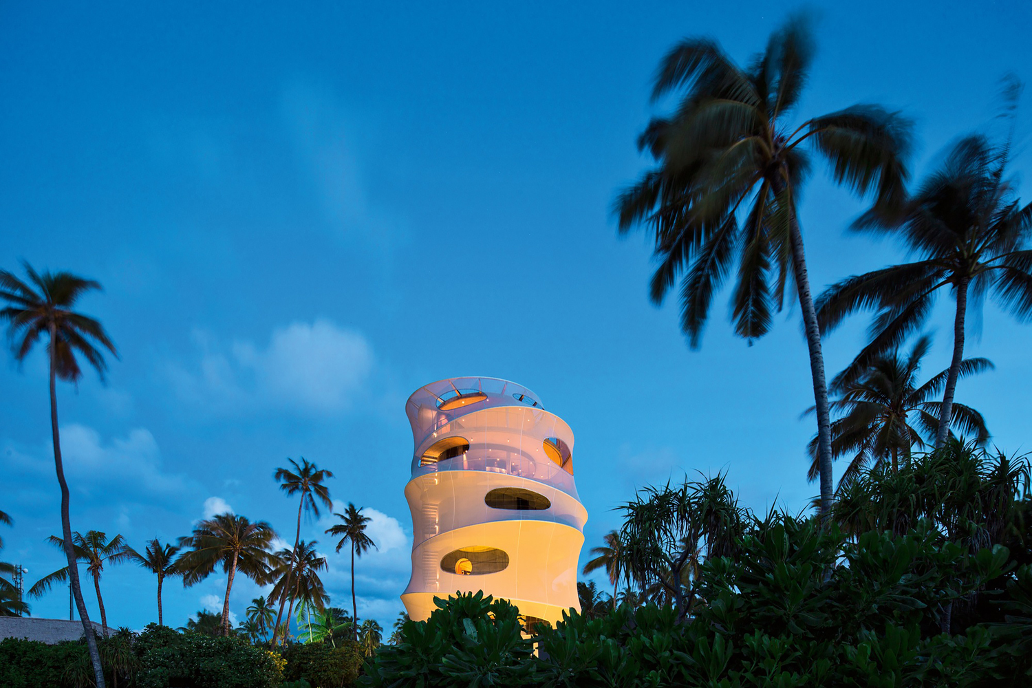 夢幻塔餐廳,位于馬爾代夫島。該建筑設(shè)計風(fēng)格有別于島上傳統(tǒng)的建筑,白色鏤空的膜結(jié)構(gòu)立面使建筑顯得超前、現(xiàn)代。