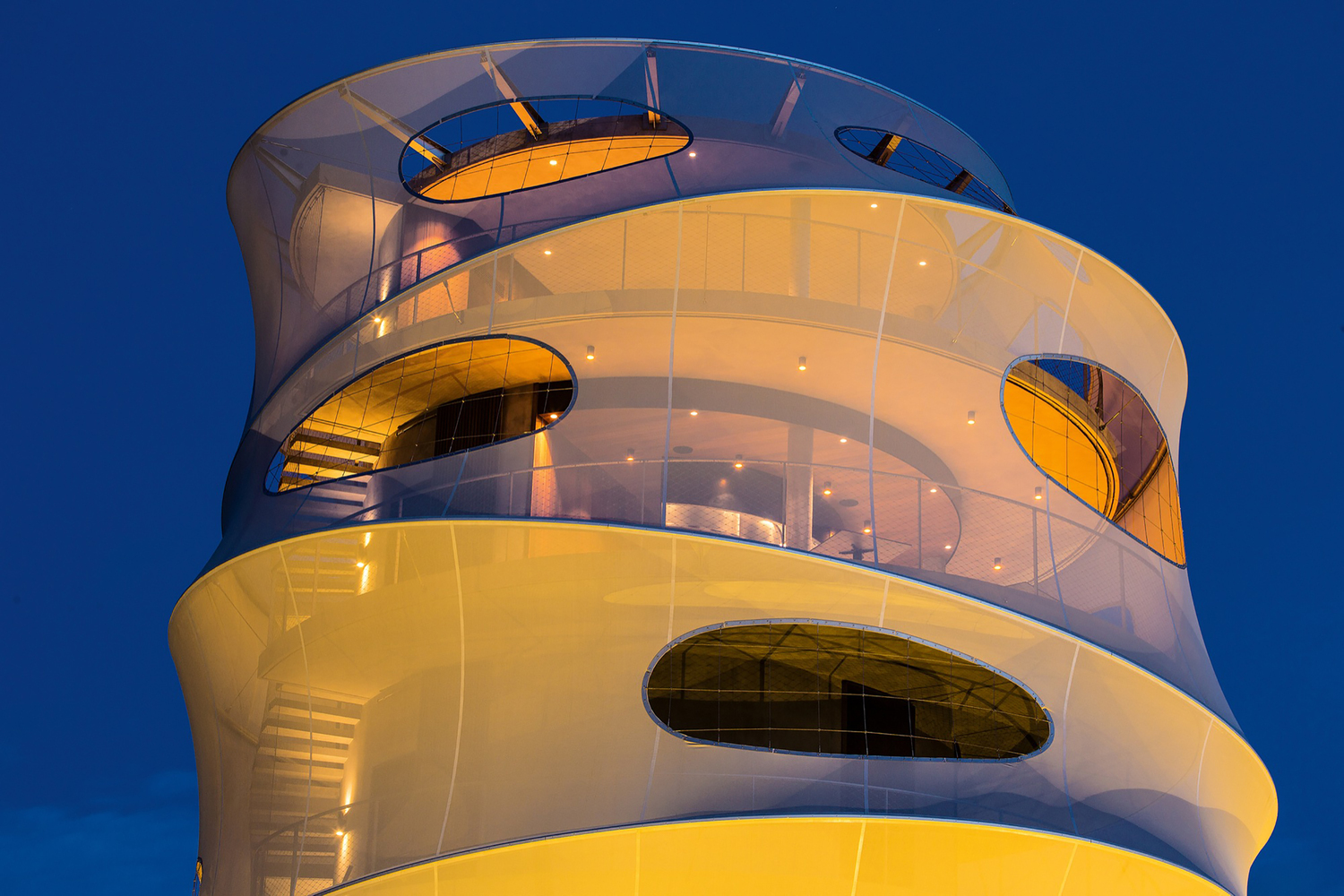 這座高23米造型獨特的建筑足以吸引全島的目光。建筑使用鋼筋混凝土作為主要材料,金屬網(wǎng)和膜結(jié)構(gòu)作為建筑立面,垂直的桶狀構(gòu)造既是它的支撐結(jié)構(gòu)也是建筑的主體,外圍使用預(yù)制樓板制成的主樓梯盤旋而上。