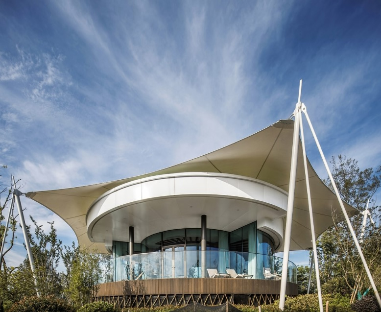 ▼酒店流線型的帆布屋頂與白色的穹頂外觀