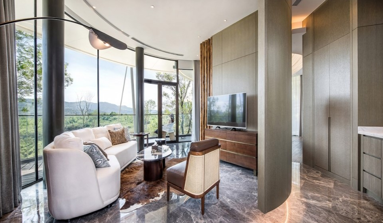 ▼大地色調(diào)的酒店以亮色、金屬色點綴