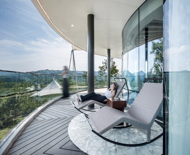 酒店整體色調(diào)以大地色為底,加上亮色、金屬色的點綴,使得整個空間線條都硬朗了起來。家具造型上以簡潔為主,既能很好地突出設(shè)計風格,又能彰顯個性。燈具飾品類以穩(wěn)重為主,加點亮色,讓空間看起來不會太沉悶。酒店每一個帳篷朝南的一側(cè)還有整扇玻璃窗,能夠獲得最開闊的景觀視野。17個帳篷內(nèi),又各有各的味道,獨具個性的色彩、家具、裝飾的搭配,在陽光的照射下,塑造出不同居舍的溫度,冷暖相宜。